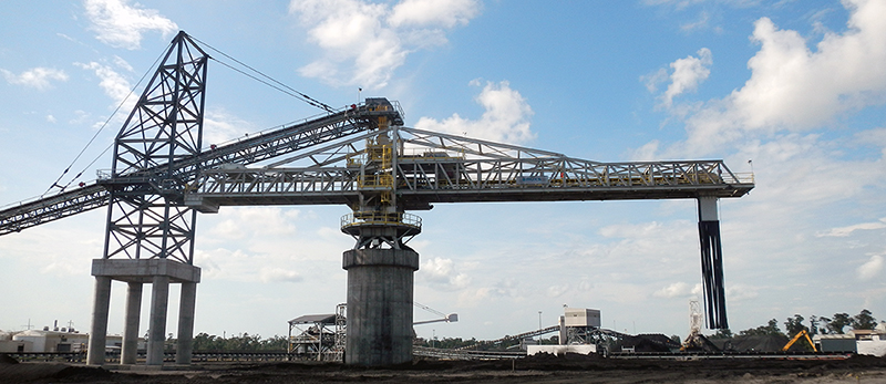 With a typical material handling capacity of 6,000t/ or higher, they build a semi-circular pile at heights in excess of 15m. The rail trucks that feed the stacker are unloaded while in motion, discharging material into receiving hoppers.